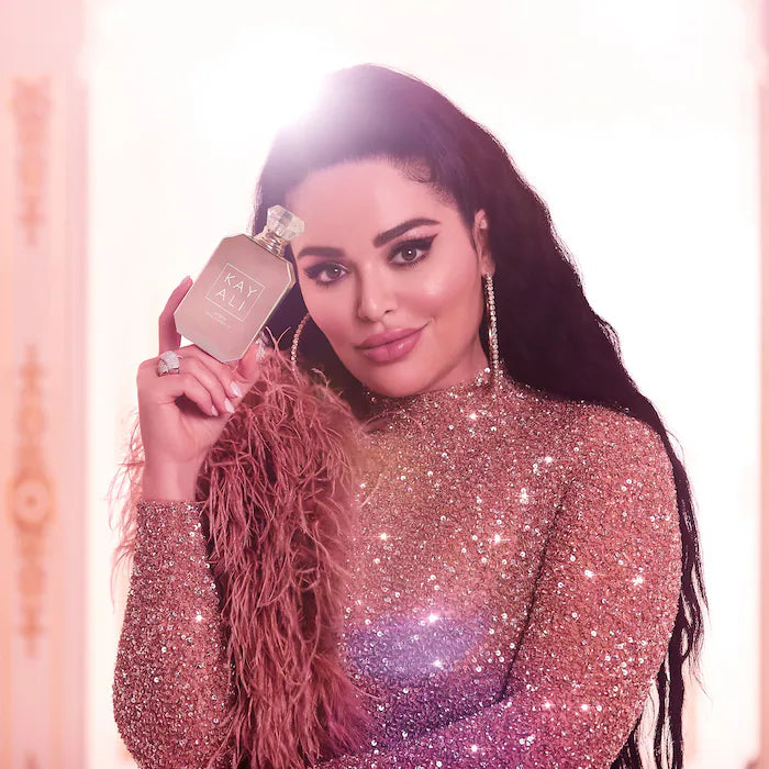 • 🪞 Frasco blanco perlado con detalles dorados, reflejo del lujo relajado de KAYALI.